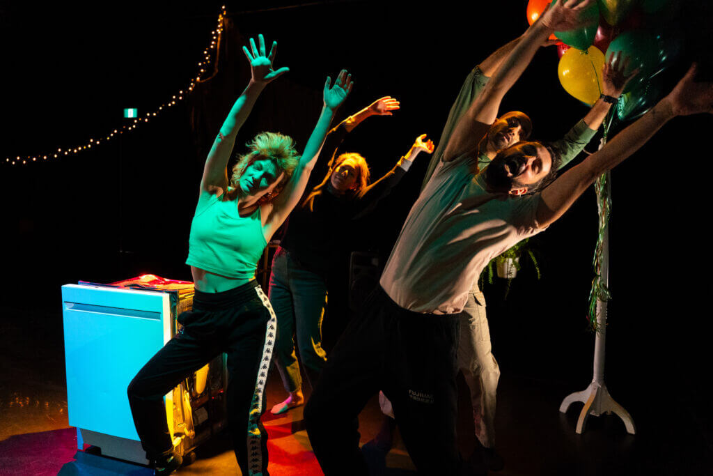 Il va falloir toujours toujours être patient·e·s, ne pas crier; il va falloir toujours toujours s’entraider, se pardonner; toujours toujours tenir la maison propre et renvoyer l’image du bonheur. C’est le défi auquel sont confronté·e·s Nina et Jonathan, bien décidé·e·s à remporter le grand jeu de la chose la plus difficile au monde: faire une famille. À chaque niveau de la compétition, mimant une configuration familiale différente, le duo va danser de tout son cœur, essayer, travailler fort… sous l’œil impitoyable et sceptique du chat de la maison, qui regarde tranquillement le foyer virer au cauchemar. Une proposition inattendue, décomplexée, hyper colorée, sans aucune frontière entre la danse et le théâtre, qui fait rire toutes les familles croches dans la salle. Toutes les familles, donc.