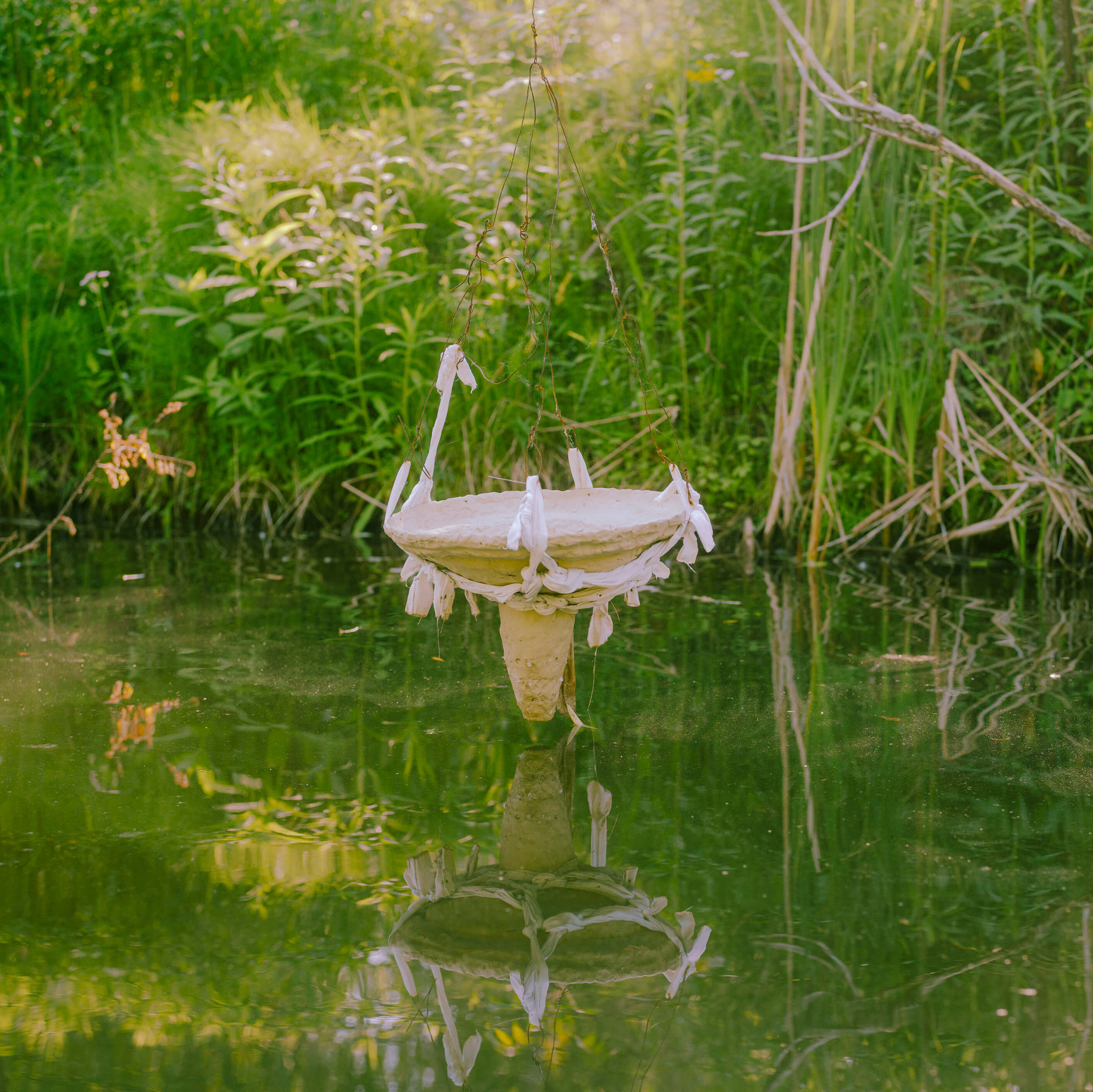 Pour cette exposition accessible à pied ou en bateau, Maude Arès a intégré une trentaine de sculptures flottantes et suspendues à l’écosystème d’un étang bordant un sentier. Les visiteur·euse·s y ont observé la transformation des récipients de céramique, brindilles, tissus et autres matières au fil de l’été.