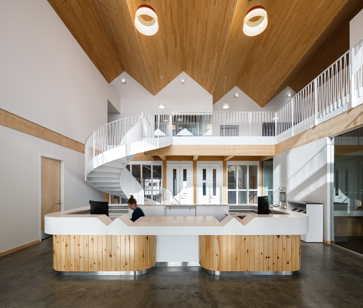 À La Pêche, l’hôtel de ville en bois massif conçu selon la norme Passivhaus (une première au Québec) allie durabilité et identité locale. La toiture en dents de scie et les accents rouges de ce bâtiment écoénergétique s’inspirent des ponts couverts de la région.