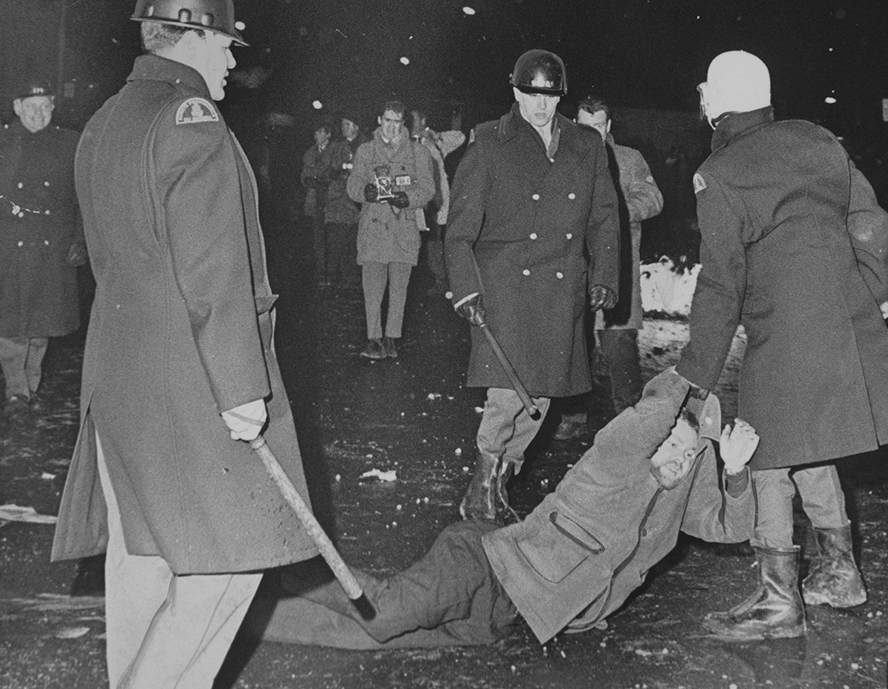 Pierre-Paul Geoffroy tabassé par la police lors d'une manifestation en soutien aux travailleurs de Seven Up, en février 1968.