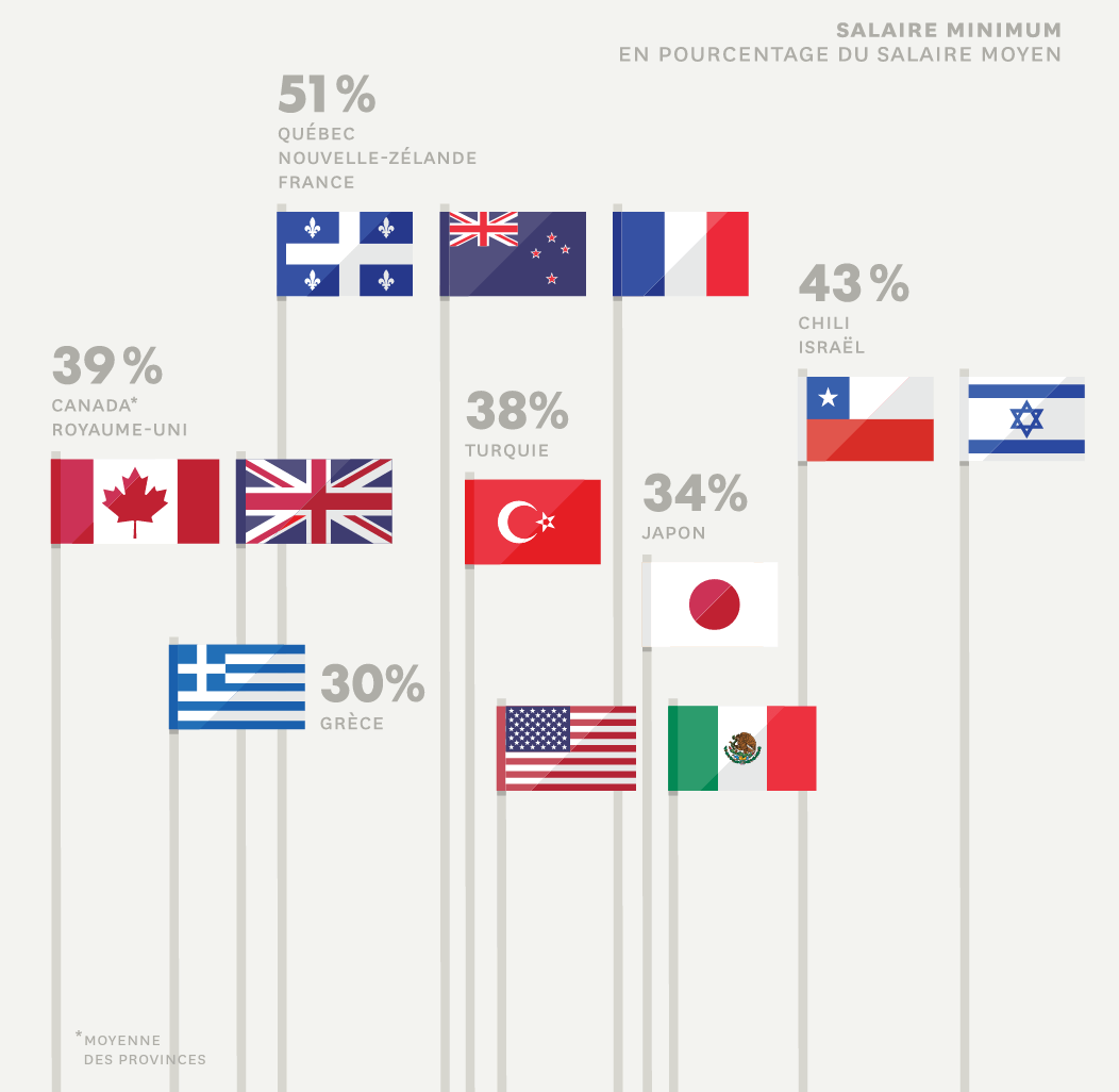 Au Québec, le salaire minimum a été haussé de 20 ¢ en mai dernier, passant de 10,15$ à 10,35$ de l’heure. En dépit d’augmentations annuelles similaires au cours de la dernière décennie, un travailleur payé au salaire minimum ne gagne aujourd’hui que 51% du salaire moyen au Québec—ce qui le classe quand même parmi les privilégiés, à l’échelle de la planète.