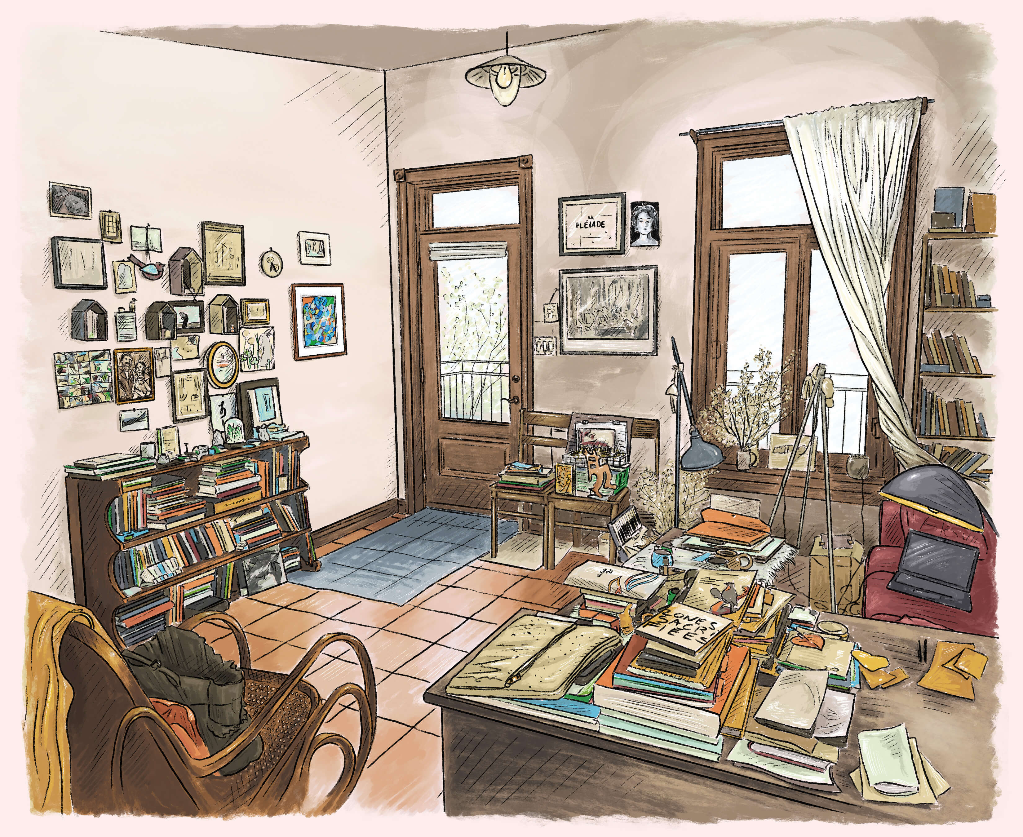 C’est entre ces quatre murs que l’autrice et réalisatrice tisse ses histoires, les chapitres de ses romans comme les scénarios de ses films. Visite d’un véritable petit musée où elle a tout le loisir de poser ses yeux entre deux élans d’inspiration.